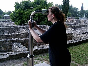 »múltba néző készülék«, a Magyar Tudományos Akadémia Számítástechnikai és Automatizálási Kutató Intézete (MTA SZTAKI) által az Aquincumi Múzeum számára kifejlesztett, szabadalmaztatás alatt álló eredeti magyar találmány. Állványon álló, kilátói távcsőre emlékeztető, 120–180 fokos szögben körbeforgatható készülék, amelybe belepillantva számítógéppel rekonstruált római kori épületek elevenednek meg az Aquincumi Romkertben. A háromdimenziós képeken keveredik a múlt a jelennel: egyrészt látjuk a romokat és azok mai környezetét, másrészt azokat a virtuálisan újjászületett épületeket, amelyeket az adott pontról láthattunk volna, ha kb. 2000 évvel ezelőtt arra sétálgatunk. Jelenleg két kronoszkóp működik Aquincumban, de további 6 telepítését tervezik a szakemberek, így az összesen 8 készülékkel szinte az egész egykori város »beutazható« lesz. A kronoszkóp lelke egy speciális videoszemüveg, amelynek mikroképernyői a múzeum főépületében elhelyezett központi számítógépekről kapják a videojeleket. A rendszert napsütés- és árnyékmérő műszerrel is ellátták, ami lehetővé teszi, hogy a virtuális épületeket az aktuális időjárási viszonyoknak megfelelően jelenítsék meg. A kronoszkóp ötlete Szentgáli Ádámtól, a SZTAKI osztályvezetőjétől származik, a megvalósításban kulcsszerepet játszott Holakovszky László mérnök, a videoszemüveg-technika hazai doyenje. Zsidi Paula múzeumigazgató a rekonstrukciók régészeti hitelességén dolgozott, de a programban építészettörténészek, gépészek, szoftverfejlesztők, elektronikus szakemberek egyaránt részt vettek.